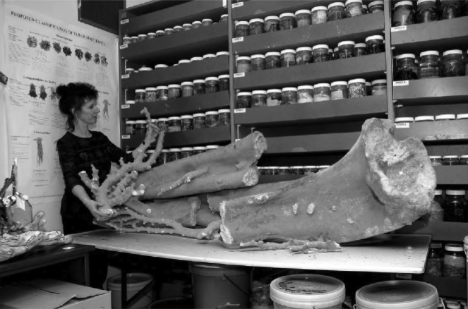 Pesquisadora ao lado de um esqueleto de coral de água profunda do gênero Paragorgia, obtido por meio de pesca acidental próxima à costa da Nova Zelândia – note o tamanho do esqueleto da colônia. Este indivíduo tinha, provavelmente, mais de mil anos de idade no momento da coleta Fotografia retirada de Roberts et al., (2009).