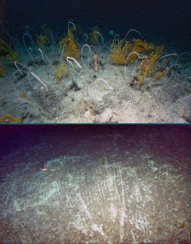 O antes e o depois da passagem de uma rede de arrasto em uma comunidade de corais de água profunda. Infelizmente, devido ao crescimento lento desses organismos, este ambiente pode demorar milhares de anos para se recuperar, se é que isso é possível. (Imagem retirada de: www.slideshare.net/devonw/response-and-recovery-potential-of-benthic-marine-ecosystems).